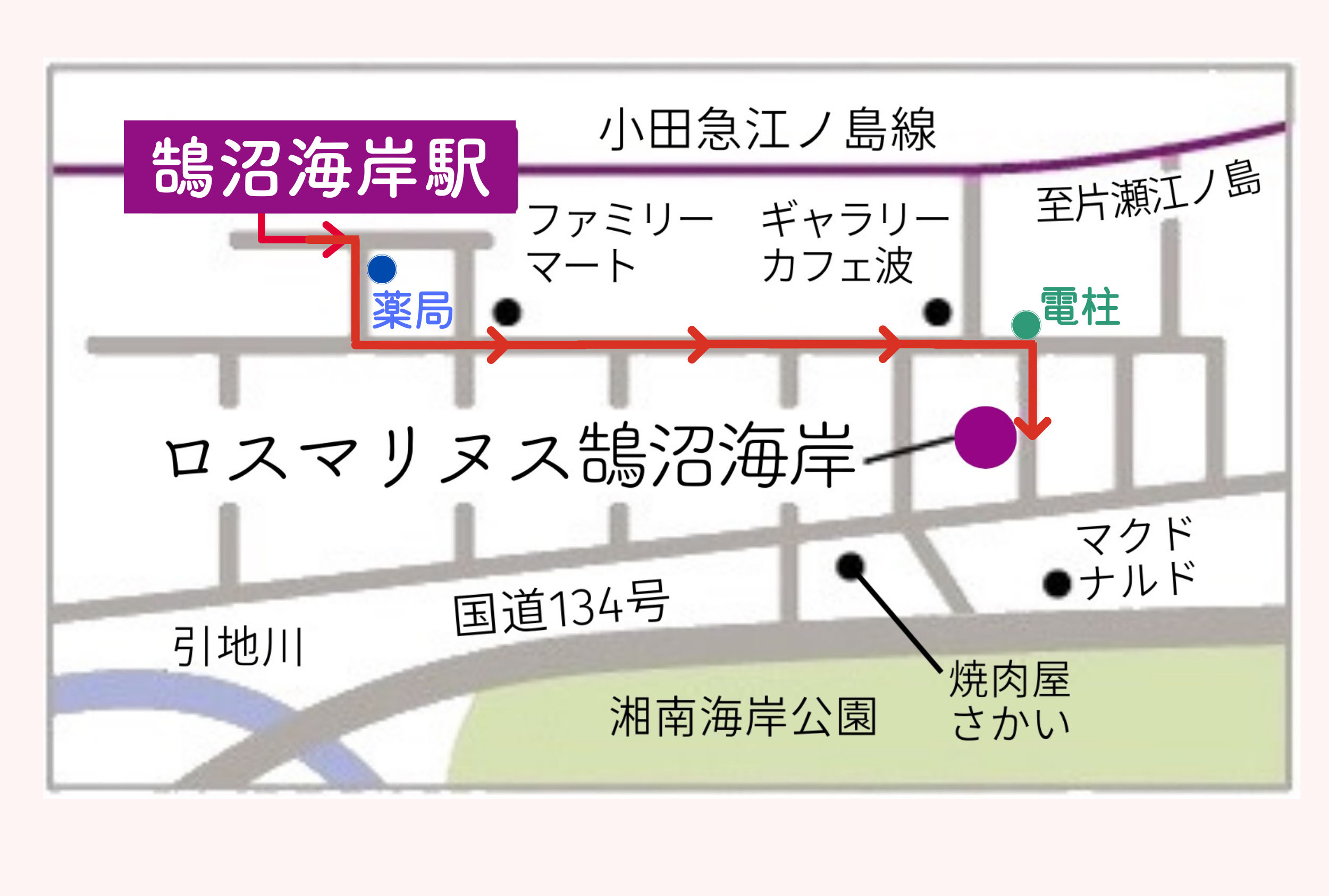 →マリンロードを江ノ島の方向へ進みます。駅から2〜3分で左側にファミリーマートがあり、さらに5〜6分進むと 左前方に「丸太整形外科」と書かれた電柱があります。